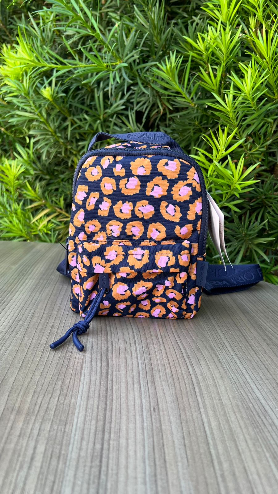 A peça possui tamanho mini, com medidas : 20x11x15 cm e fechamento superior por zíper, alças ajustáveis, bolso frontal com fechamento por zíper e puxador, tag da marca emborrachada aplicada na lateral, alça de mão e alças de ombro em gorgorão com nome da marca em baixo relevo versão em poliéster . pode ser utilizada nas costas ou como bolsa de ombro.